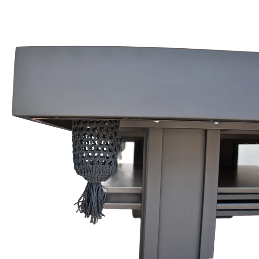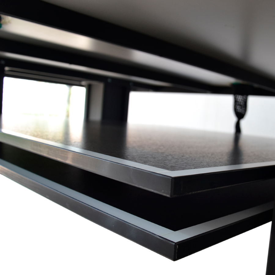 Desde la viga perimetral hasta las patas, todo está fabricado con acero cortado a láser y plegado con máxima precisión. Este material no solo aporta firmeza y durabilidad, sino también una estética moderna y sólida.