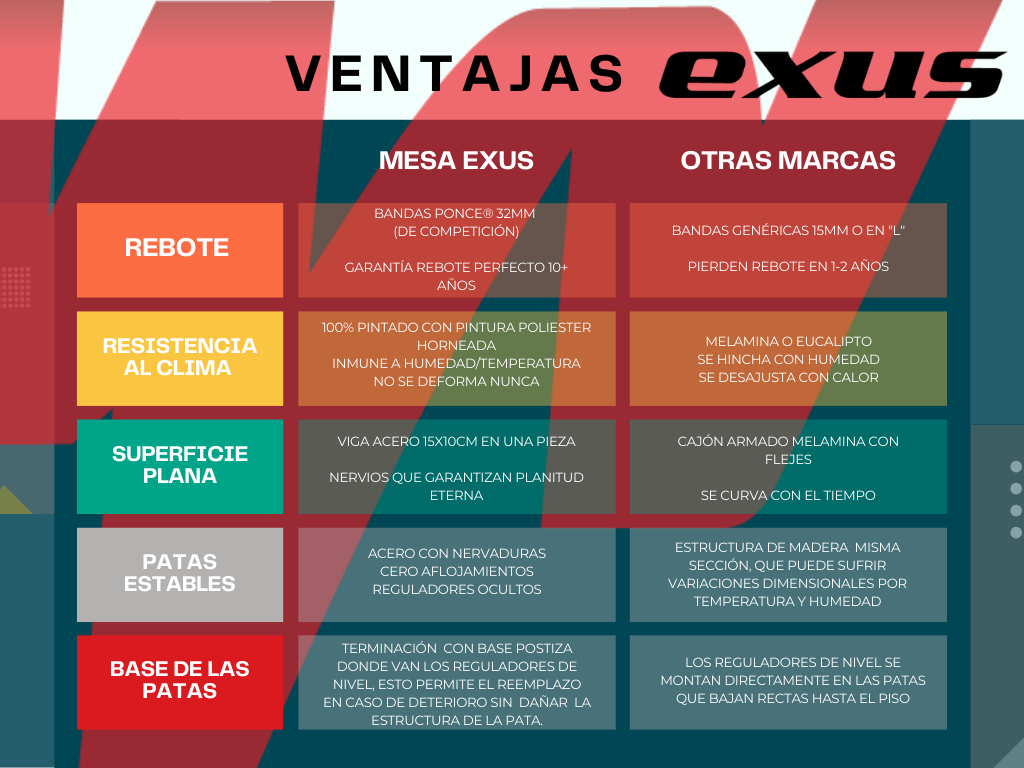 Incorporamos las reconocidas bandas triangulares Ponce®, de 30 mm de espesor, ideales para competiciones y jugadores exigentes. Estas bandas, en conjunto con la estructura metálica, proporcionan un rebote inigualable.